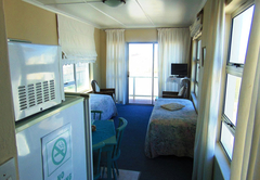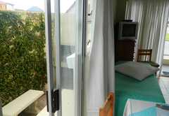 This comfortable ground floor family unit offers self-catering facilities and a partial sea view. The unit has a living room with two beds, leading into an en-suite double bedroom furnished with two single / twin beds. The living room has easy chairs and a TV, DSTV decoder and smart card, along with a fully-equipped kitchenette area with table and chairs for dining. From the living area, step out of the glass sliding door on to your own stoep with a sea-view. The unit is fully equipped and serviced each morning, when the beds are made, dishes washed and a cleanup performed.
