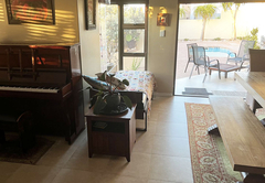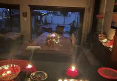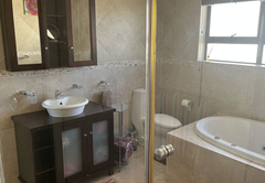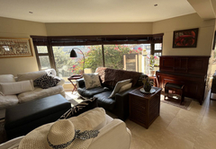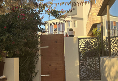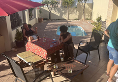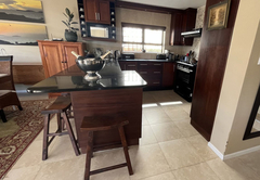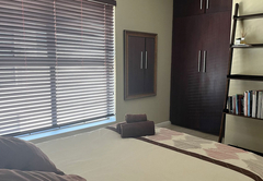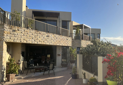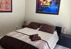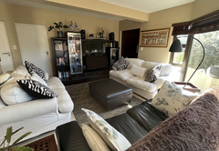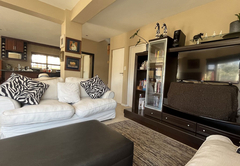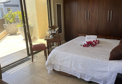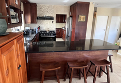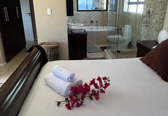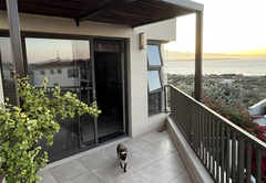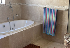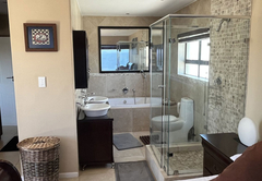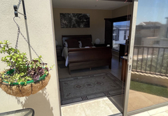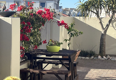 Whispering Waves has three bedrooms, two bathrooms, and a separate toilet. The house can accommodate up to six guests. The main bedroom is located upstairs and is furnished with a Queen-size bed. This room has a balcony and an en-suite bathroom fitted with a bath, shower, toilet, and washbasin. The second and third bedrooms are each furnished with a Queen-size bed. These bedrooms share a bathroom fitted with a bath, shower, toilet, and washbasin. All linen and towels are provided. The open-plan kitchen is well-equipped with a fridge-freezer, microwave, oven, gas stove, dishwasher, cutlery, crockery, and tea- and coffee-making facilities. The spacious living area features a TV with Netflix and DStv, comfortable seating. Folding doors open onto the patio with outdoor seating, a braai area, and a swimming pool. Guests can enjoy free Wi-Fi and secure parking.