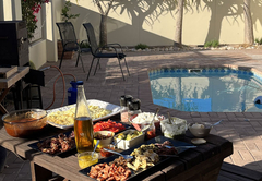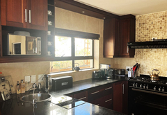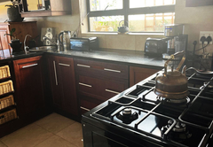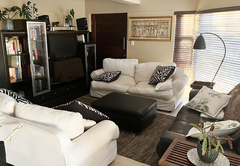 Die offene Küche ist gut ausgestattet mit Kühlschrank mit Gefrierfach, Mikrowelle, Backofen, Gasherd, Geschirrspüler, Besteck, Geschirr sowie Tee- und Kaffeekocher. Der geräumige Wohnbereich verfügt über einen Fernseher mit Netflix und DStv sowie bequeme Sitzgelegenheiten.