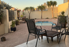 Falttüren öffnen sich auf die Terrasse mit Sitzgelegenheiten im Freien, einem Grillplatz und einem Swimmingpool.