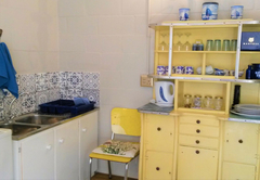 Das Wohnzimmer und die Küche mit offenem Schnitt verfügen über einen Innengrill, einen Barkühlschrank, eine Mikrowelle, eine Kochplatte, einen Wasserkocher, einen Toaster, Geschirr und Besteck.