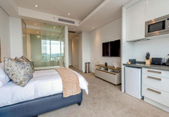 Madison Palms 28 ist eine Ferienwohnung für Selbstversorger in Sandown für zwei Gäste. Das Studio ist mit einem Queen-Size-Bett ausgestattet. Es gibt einen gemütlichen Loungebereich mit TV, WLAN und einem Esstisch, an dem Sie Ihre Mahlzeiten genießen können. Draußen ist eine Terrasse mit einem Tisch und